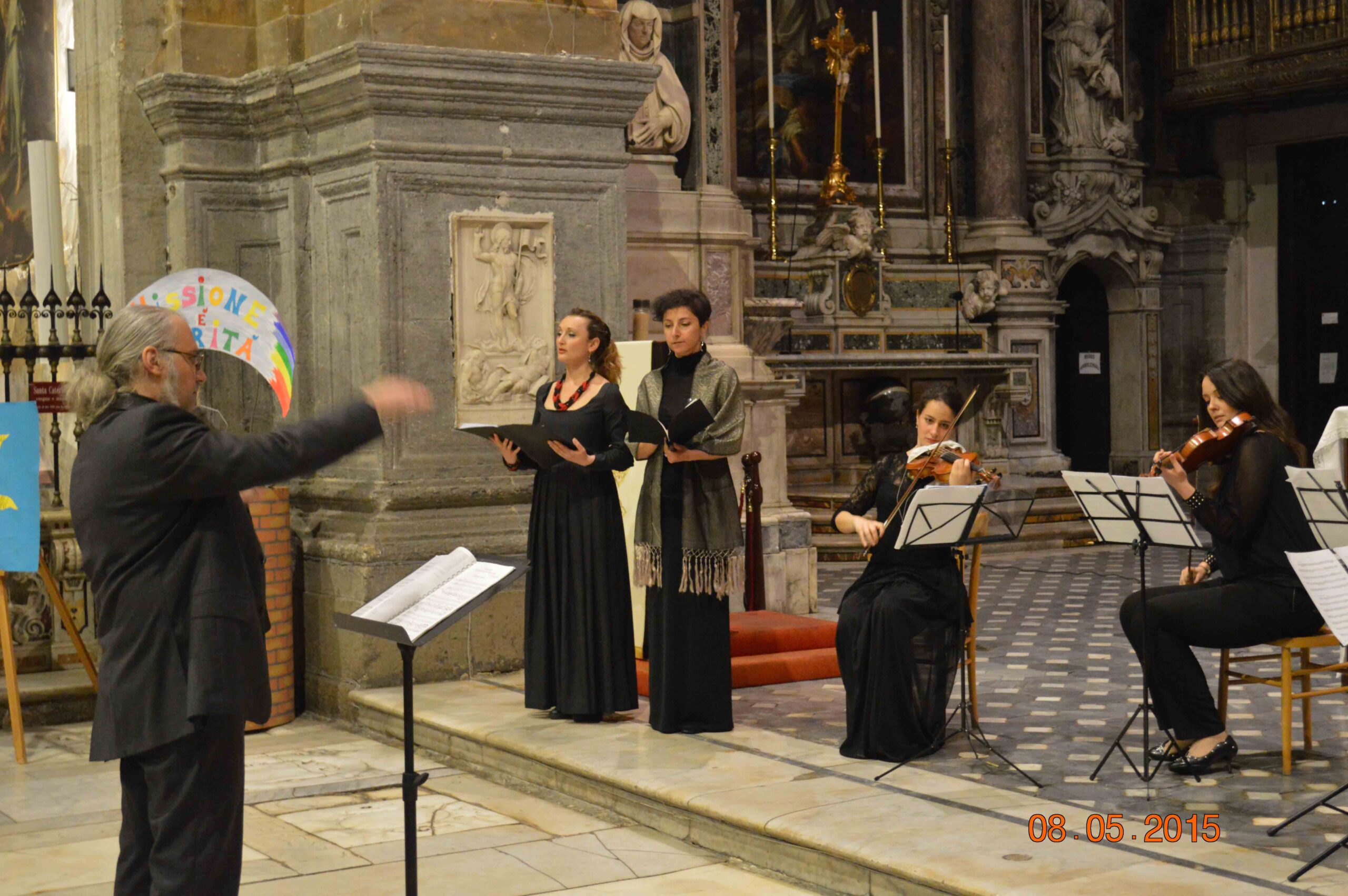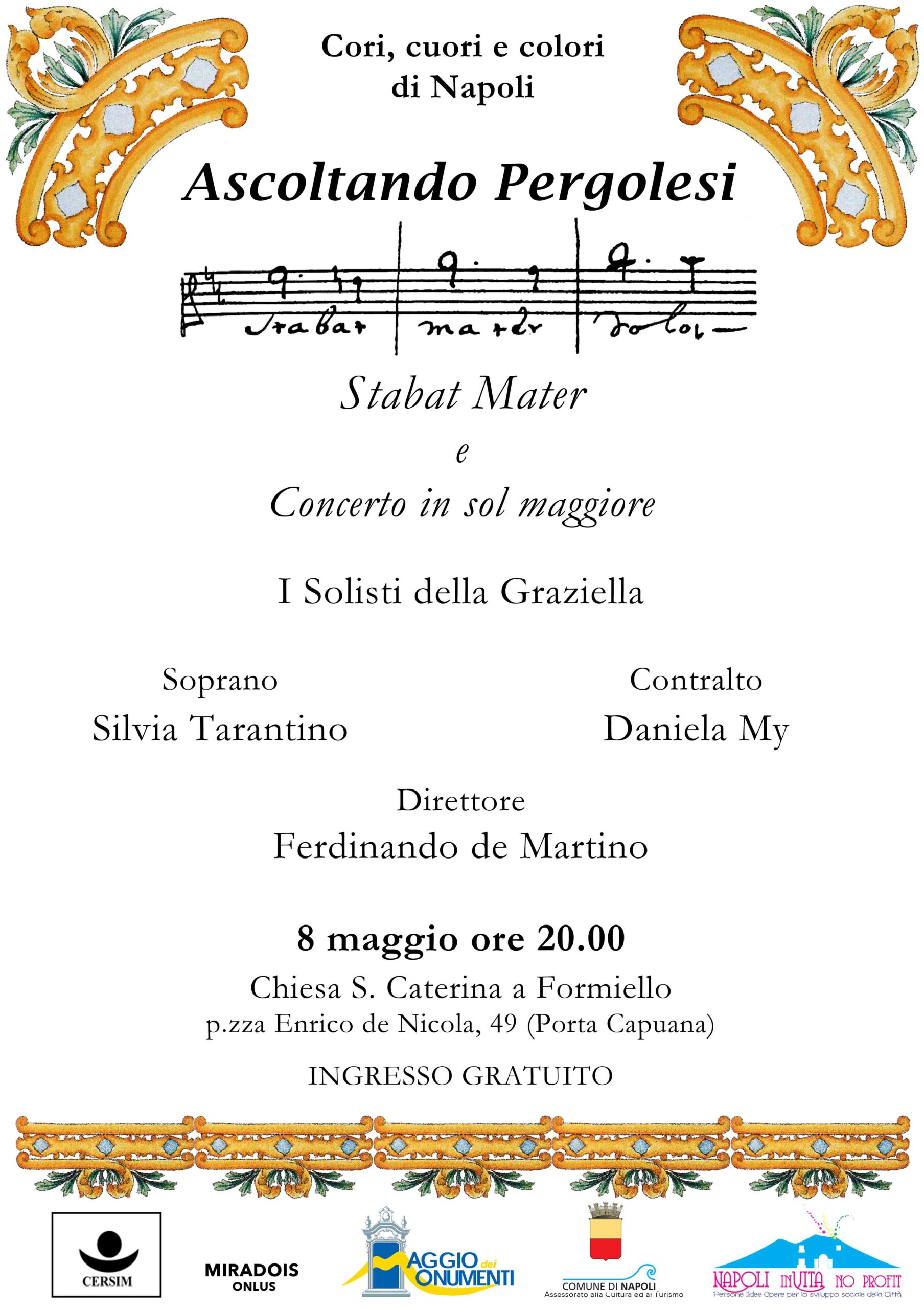 Con “ASCOLTANDO PERGOLESI” il Maestro Ferdinando de Martino ha riproposto, nell’ambito del “Maggio dei Monumenti”, l’esecuzione dello “Stabat Mater” nella splendida cornice della Chiesa di S. Caterina a Formiello. Si è offerto, così, l’occasione al folto pubblico partecipante di riflettere sulla Napoli ai tempi di Carlo III, epoca in cui la Città, con i suoi quattro Conservatori, era la capitale europea dell’Opera e, soprattutto, della commedia per musica.