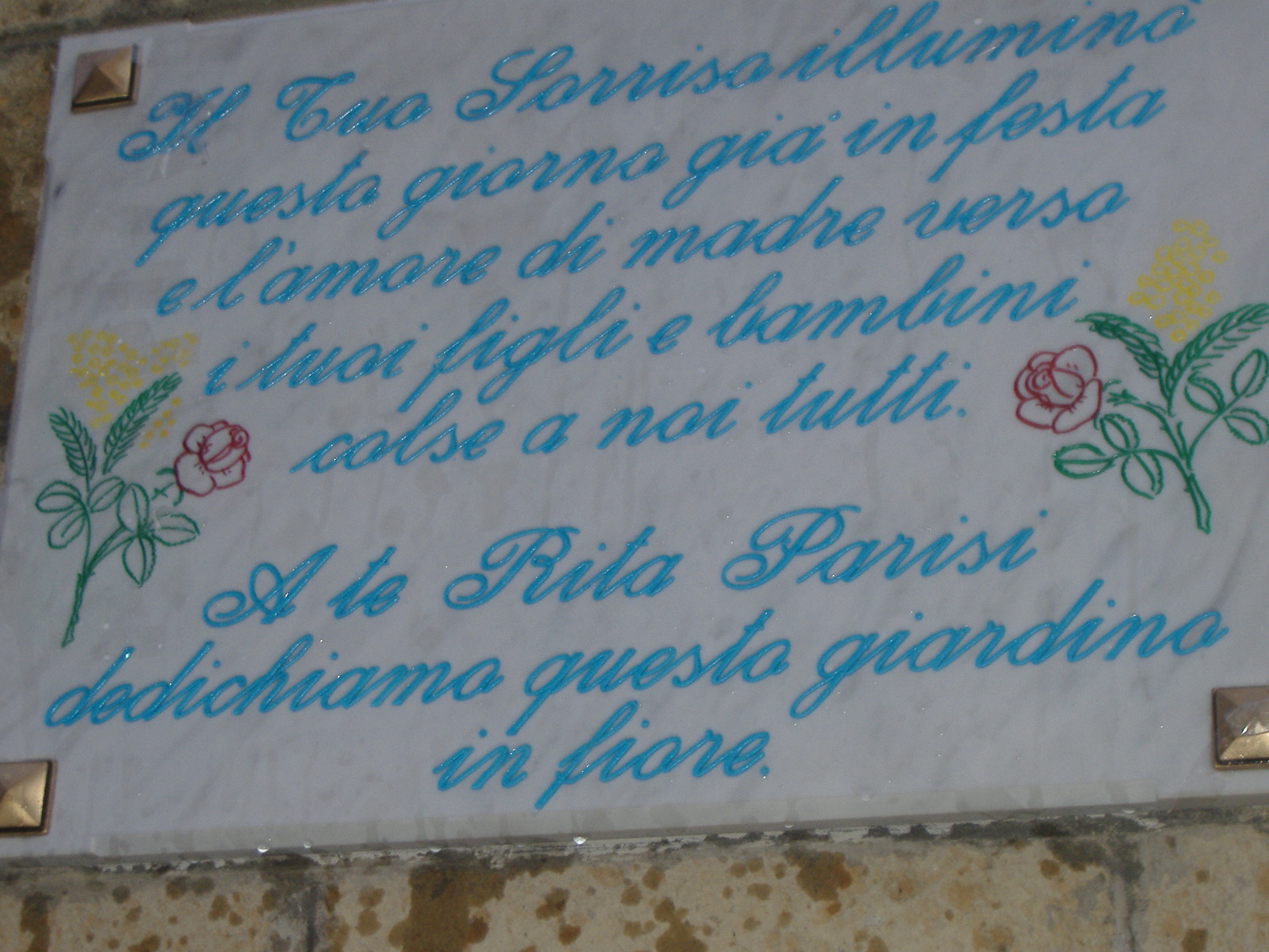 Nel maggio 2011, però, il Parco è stato chiuso a causa di atti vandalici che lo resero inagibile. Allora la gente del luogo, con l’appoggio di varie rappresentanze di associazionismo sociale, si è di nuovo rimboccate le maniche è così il Parco è stato riaperto al pubblico nell’aprile 2014 ed oggi è di nuovo pronto per ospitare iniziative autogestite o istituzionali. Commovente è la targa che puoi leggere all’ingresso, alla quale è affidato il ricordo di Rita Parisi, madre di una ragazza del quartiere, che si è impegnata per la riapertura del Parco ed è scomparsa improvvisamente il giorno seguente l’inaugurazione della riapertura.